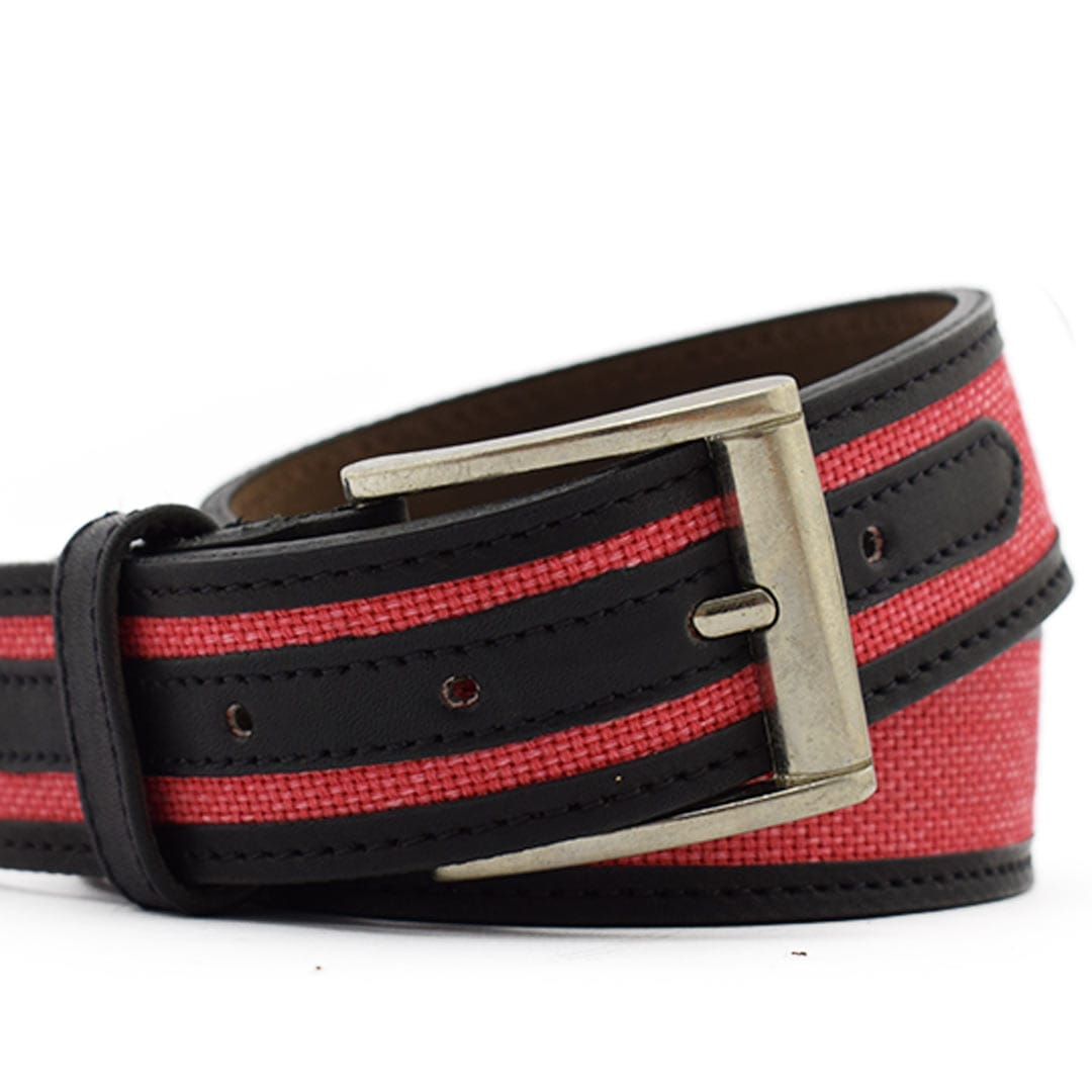 Cinturón de hombre con diseño exclusivo que combina cuero negro y detalles en material textil rojo. Su hebilla metálica clásica aporta un toque robusto, mientras que su estilo único lo hace ideal para looks casuales con un toque de originalidad y color.