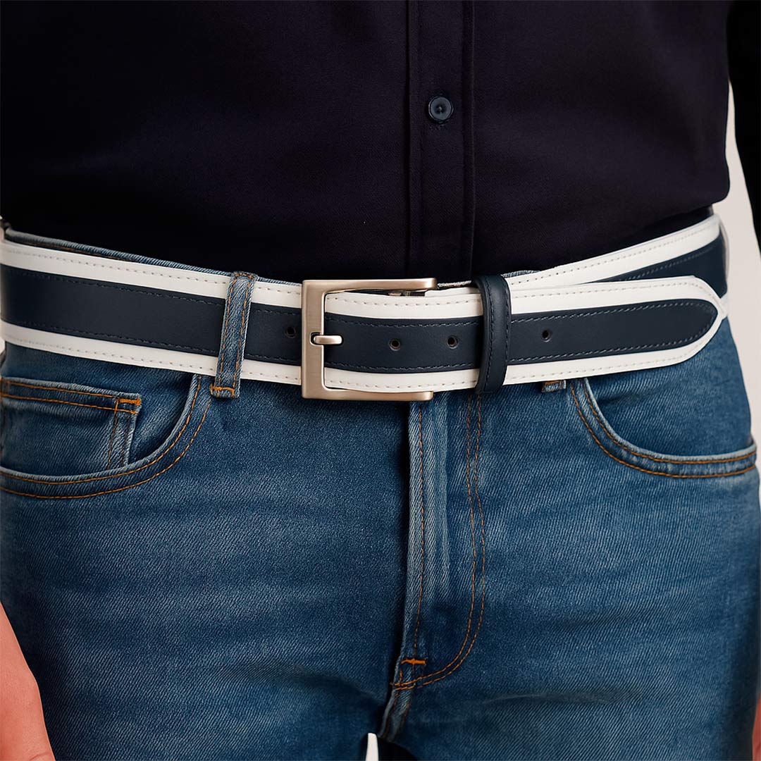 Cinturón de hombre en cuero con un diseño bicolor elegante y sofisticado. Su acabado liso con costuras decorativas y su hebilla metálica clásica lo convierten en el complemento ideal para looks formales y casuales. Un accesorio versátil que combina estilo y calidad.