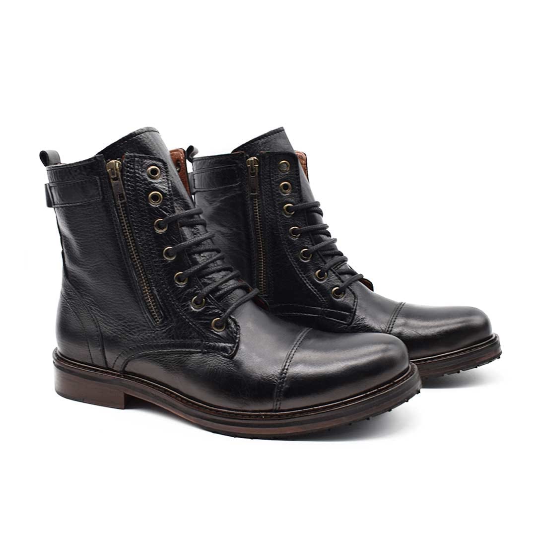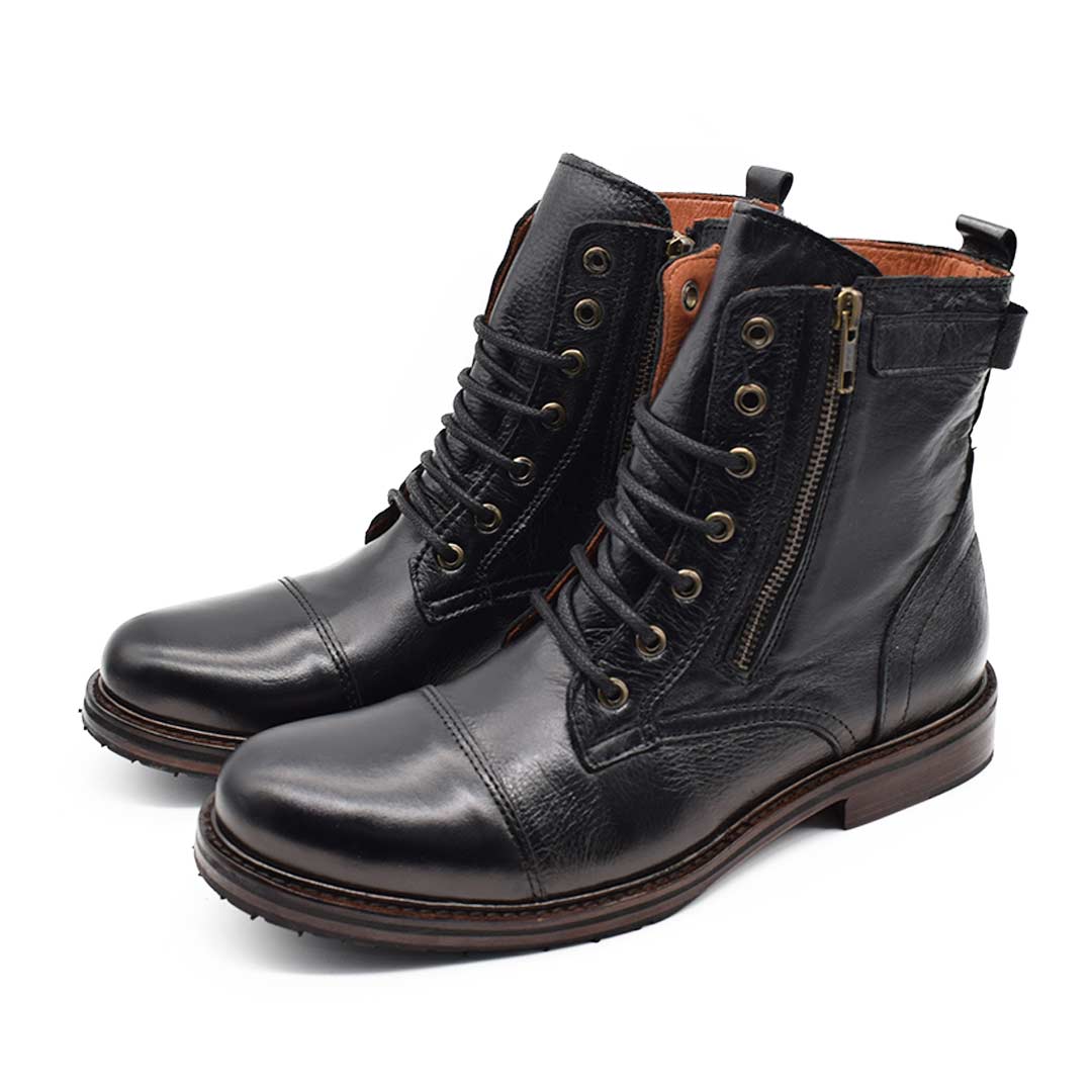 Este borcego de cuero combina el diseño tradicional con detalles funcionales pensados para el día a día. Con doble cierre lateral y cordones, permite un calce rápido y seguro, sin resignar estética. Su suela de goma antideslizante asegura buena adherencia, mientras que las costuras visibles y los herrajes metálicos refuerzan su carácter robusto.