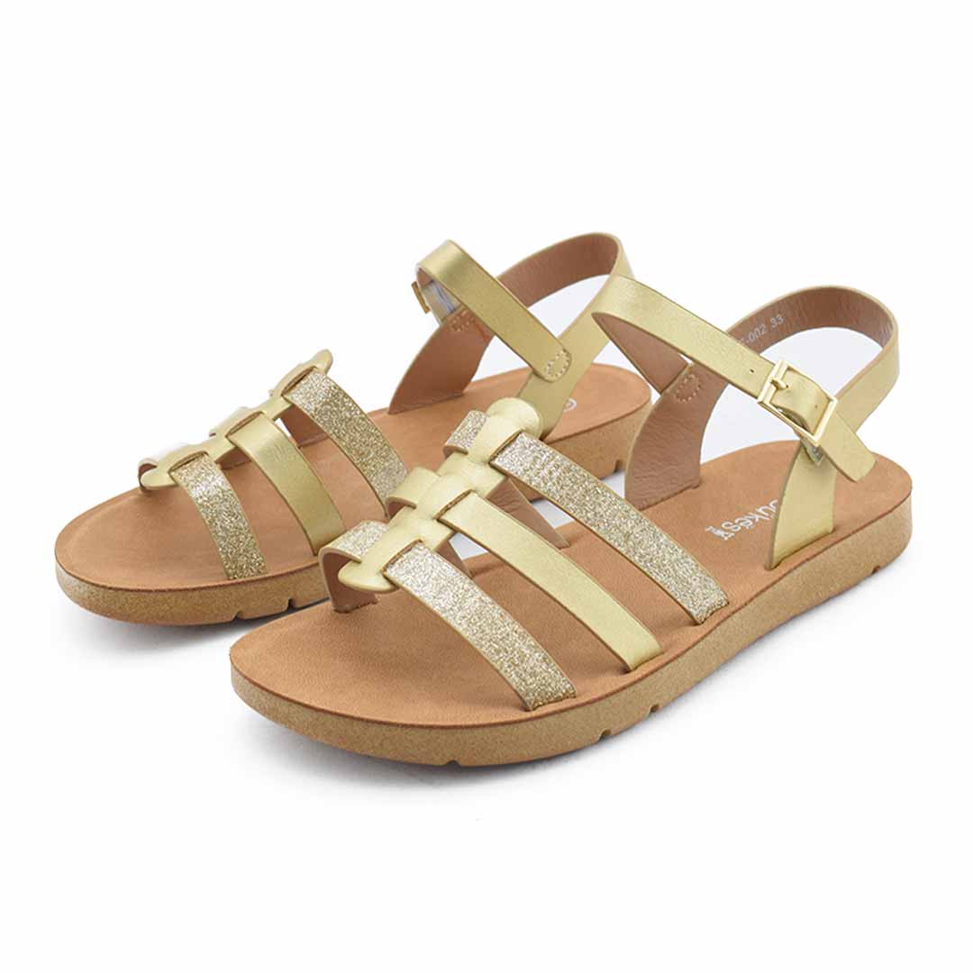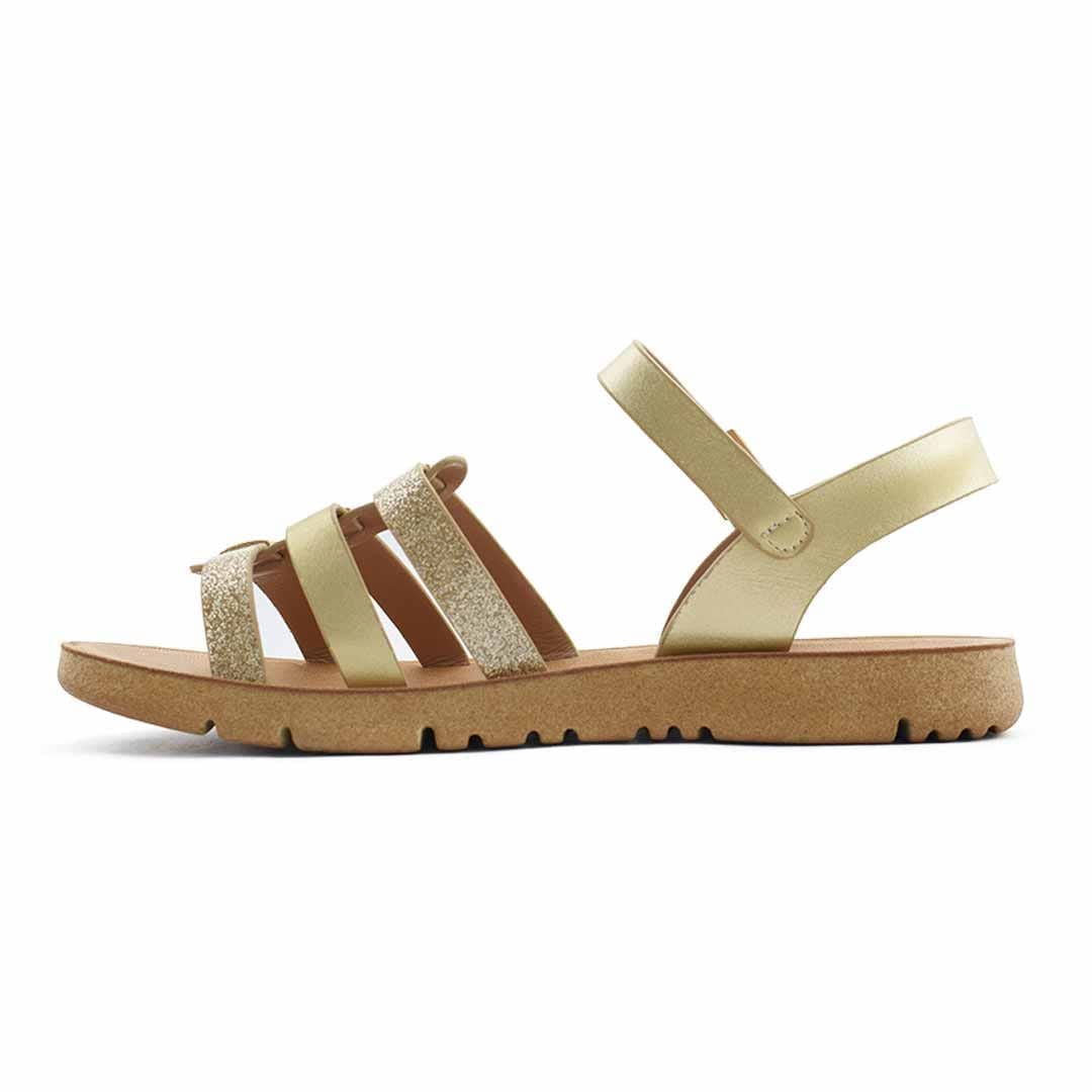 Sandalias color oro para niñas que adoran brillar. Con tiras con glitter y un diseño cómodo, son perfectas para jugar, pasear o usar en ocasiones especiales. Su cierre ajustable asegura que se mantengan siempre en su lugar.