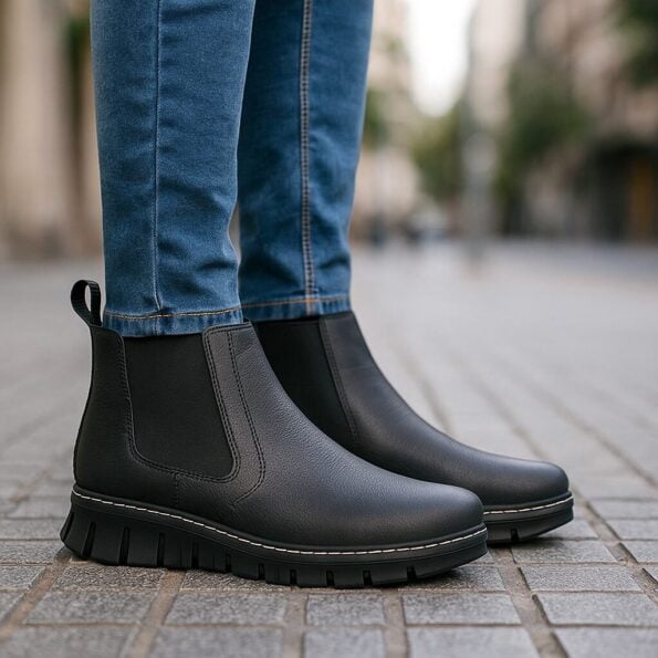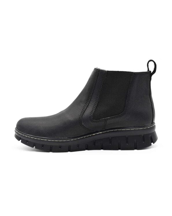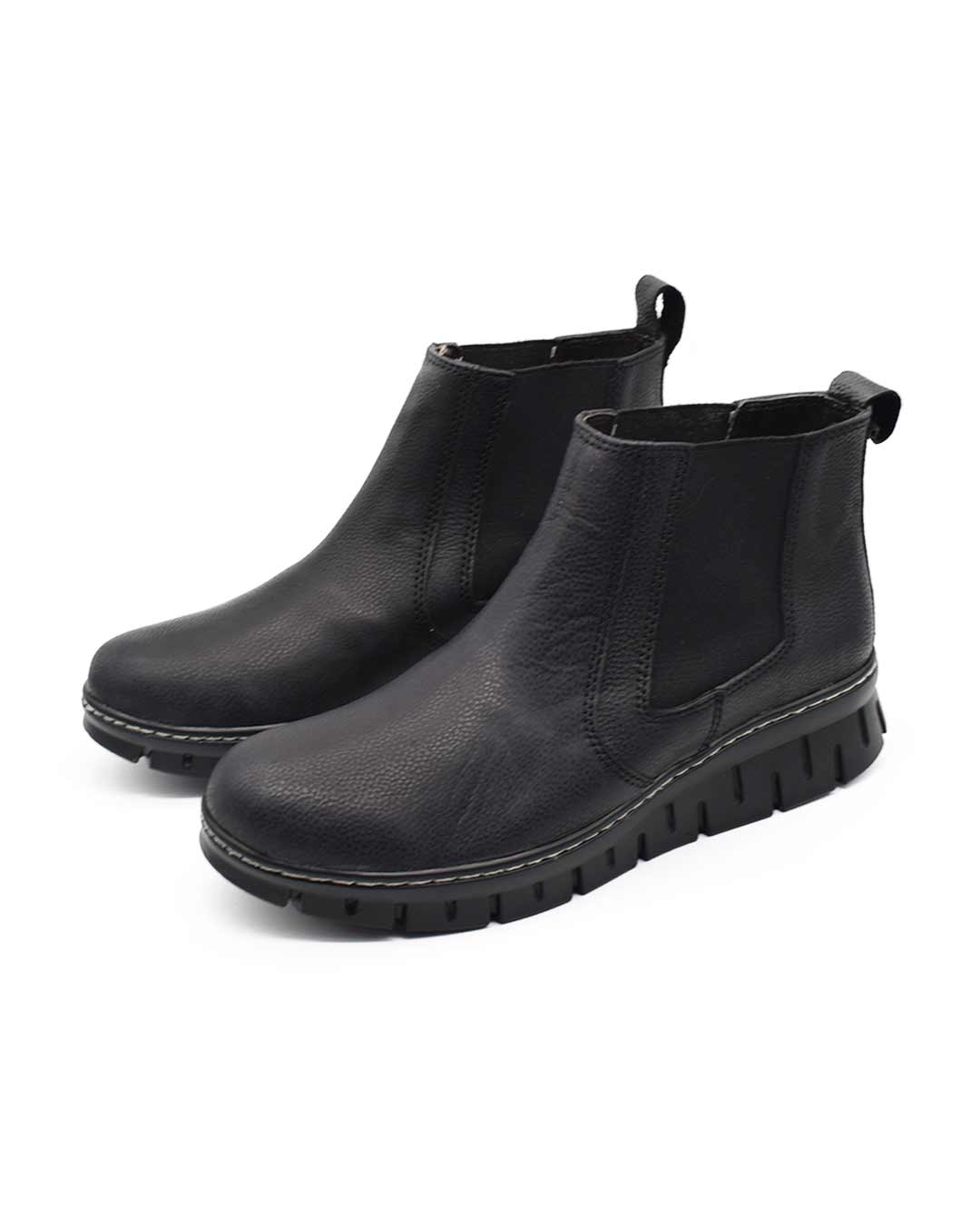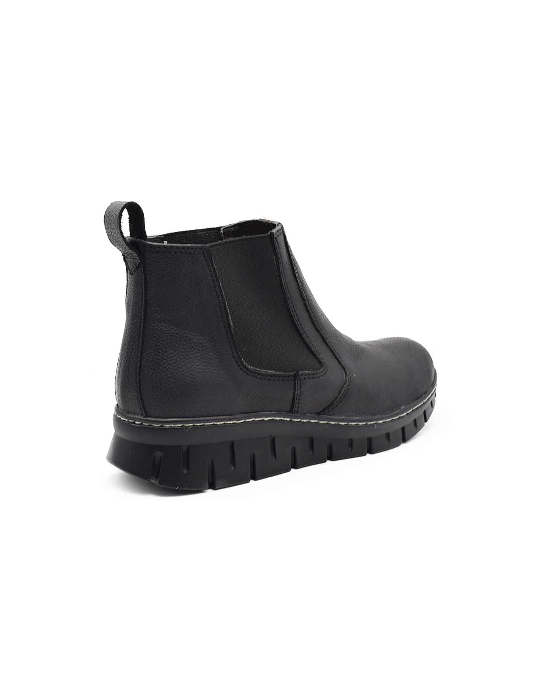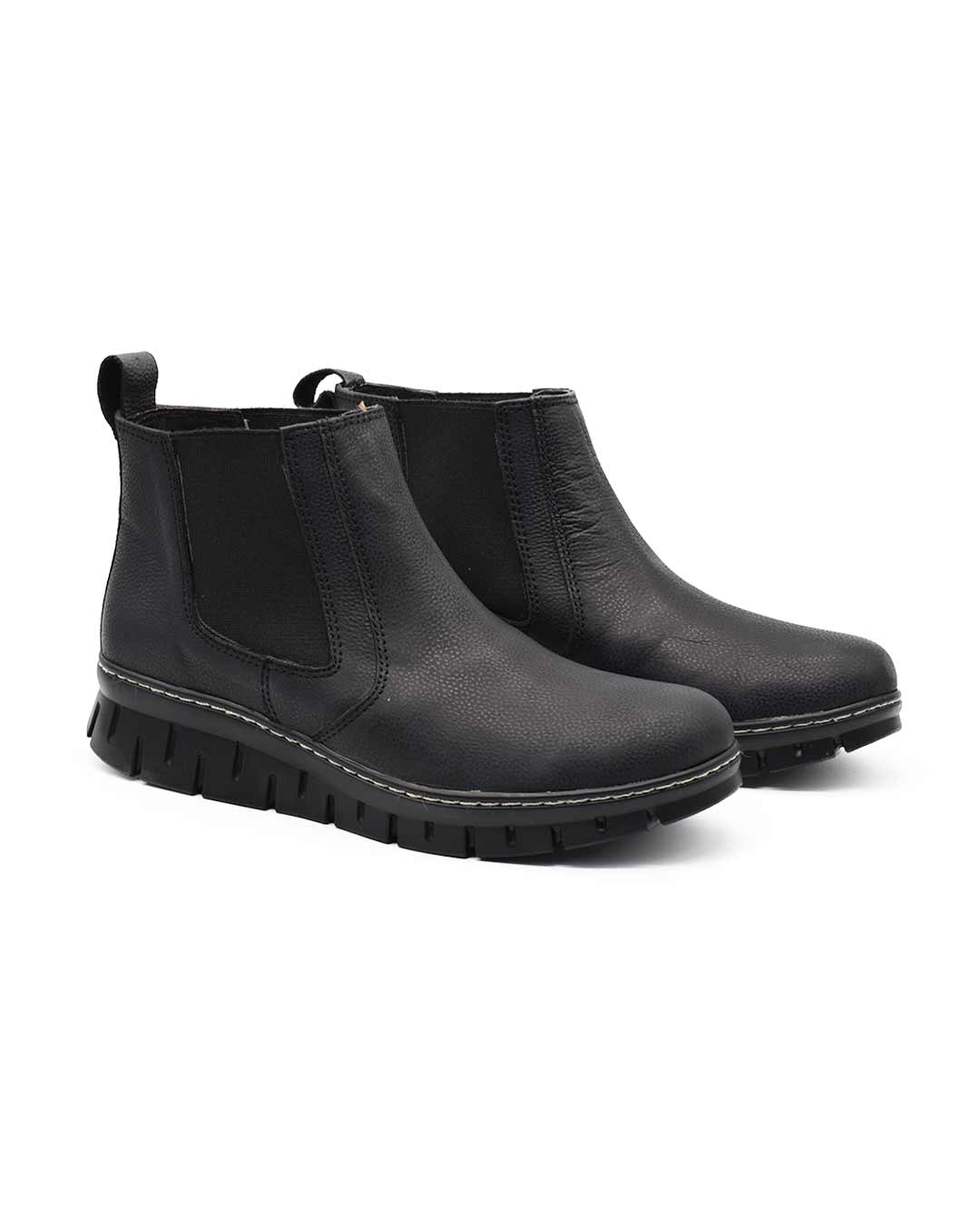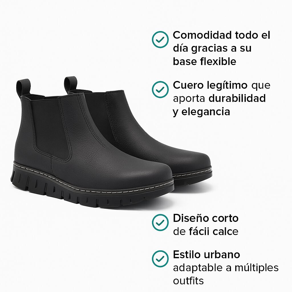 Esta bota con capellada de cuero legítimo con textura levemente graneada, tiene elásticos laterales anchos para calce fácil y una costura lateral en L invertida como detalle distintivo
