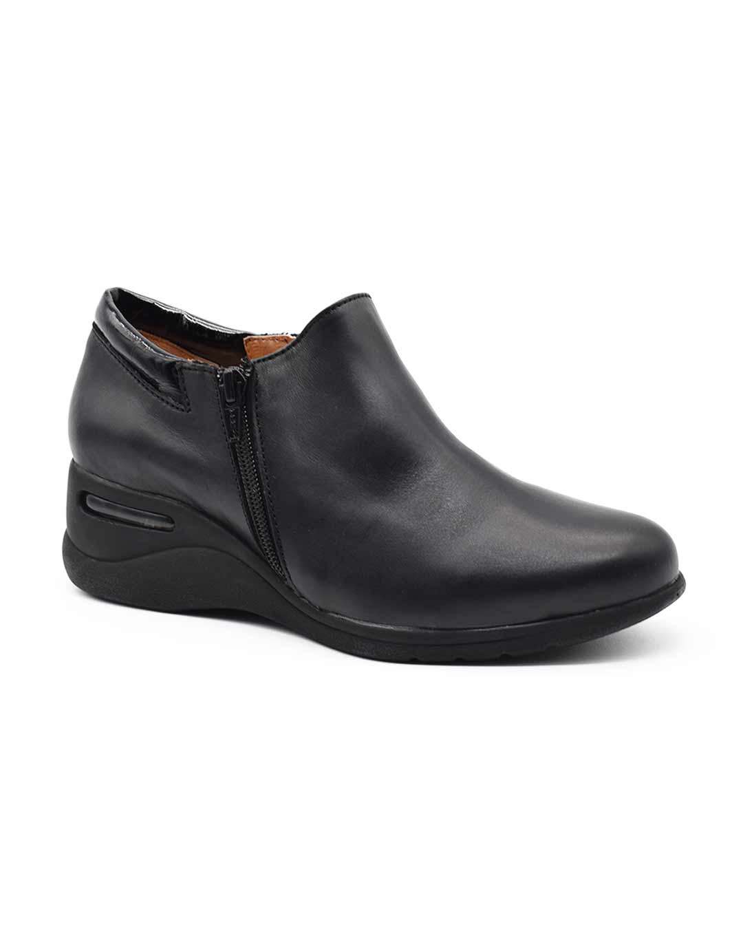Bota corta de mujer en cuero legítimo, con diseño moderno y práctico para uso diario. Con base elevada y cámara de aire, ideal para caminar con comodidad todo el día.