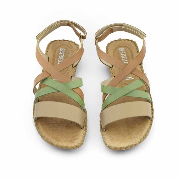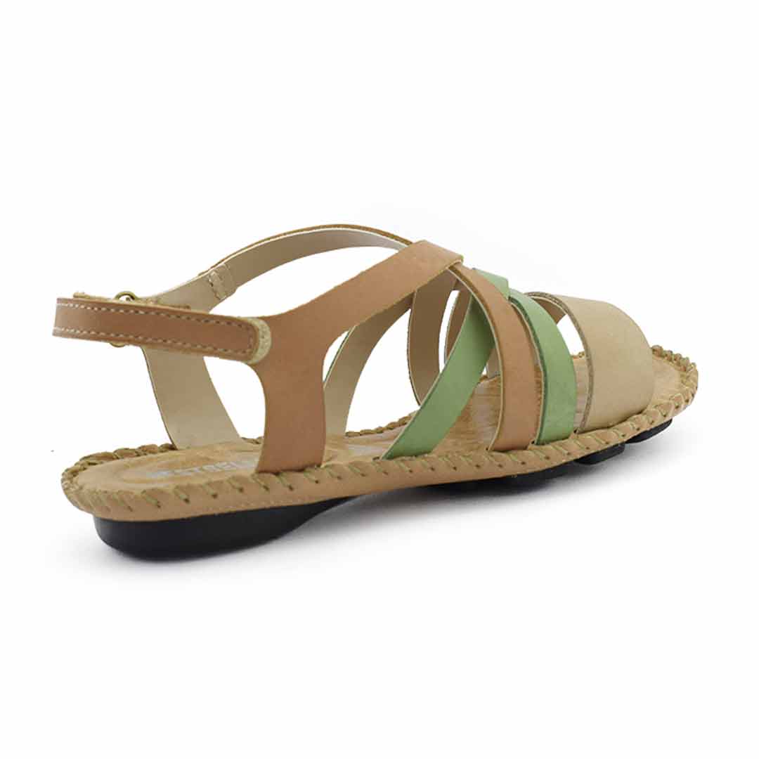 Sandalia Gaela fresca y ligera con tiras cruzadas en tonos visón, verde y suela. Su diseño con velcro ajustable en el talón ofrece un calce seguro y cómodo. Ideal para looks casuales en días de verano, esta sandalia combina estilo y funcionalidad gracias a su suela confort.