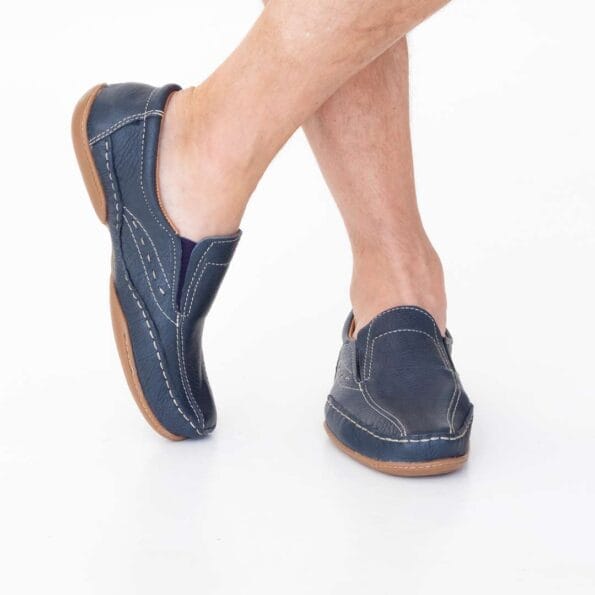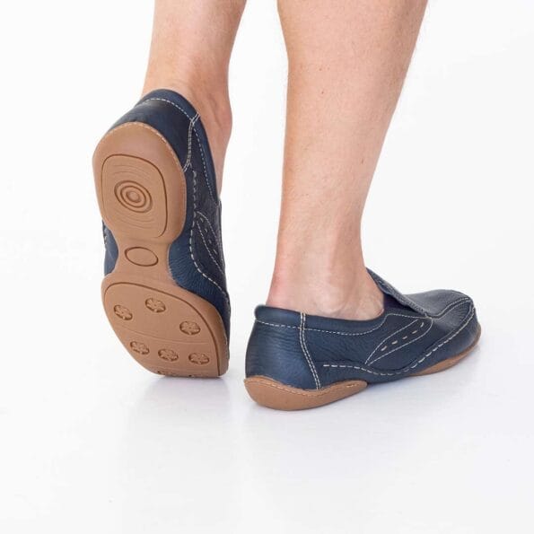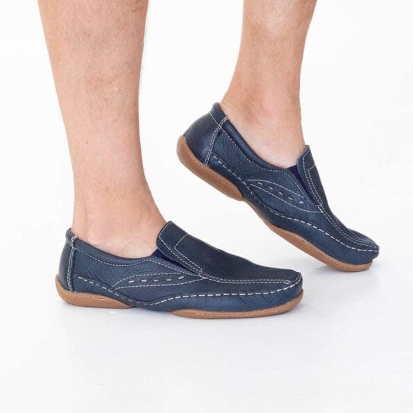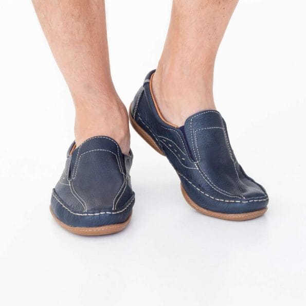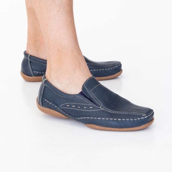 Náuticos en color azul y detalles en marrón, confeccionados en cuero texturizado para un look elegante y discreto. Su estructura sin cordones permite un calce fácil y cómodo, mientras que la suela flexible asegura comodidad en cada paso.