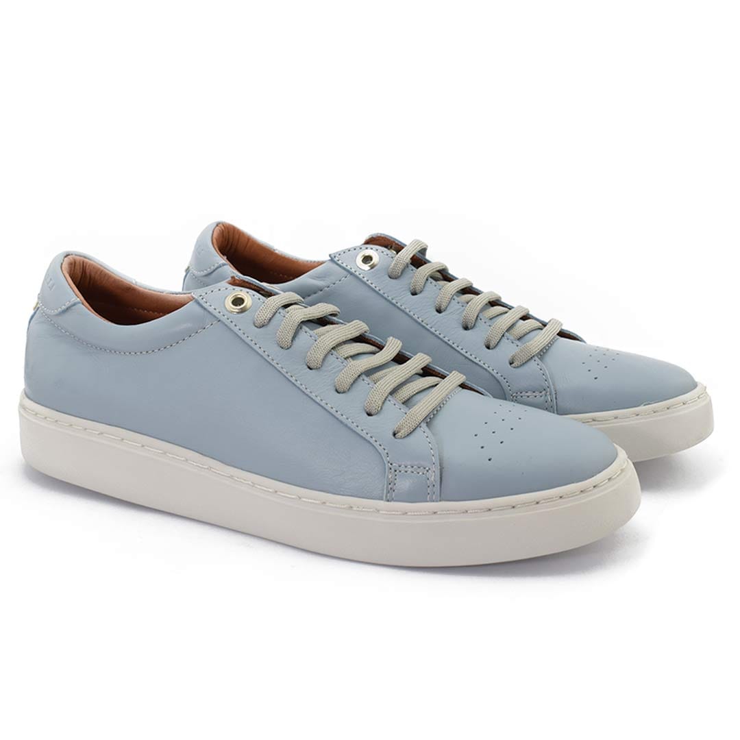 Zapatilla en cuero color celeste con diseño clásico y ojales metálicos. Su estilo casual y fresco es ideal para un look versátil y moderno, perfecto para el uso diario.