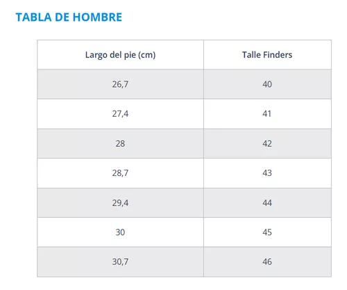 Talles MujerTalles HombreTalles NiñosTalle Mujer Centímetros 35 23.3 cm 36 24 cm 37 24.6 cm 38 25.3 cm 39 26 cm 40 26.7 cm 41 27.4 cm Talle Hombre Centímetros 38 25.3 cm 39 26 cm 40 26.7 cm 41 27.4 cm 42 28 cm 43 28.7 cm 44 29.3 cm 45 30 cm 46 30.7 cm Talle Niños Centímetros 25 AR 16.5 cm 26 AR 17 cm 27 AR 17.4 cm 28 AR 17.8 cm 29 AR 18.3 cm 30 AR 19.1 cm 31 AR 19.5 cm 32 AR 20.4 cm 33 AR 20.8 cm 34 AR 21.6 cm 35 AR 22.5 cm 36 AR 22.9 cm - Información importante