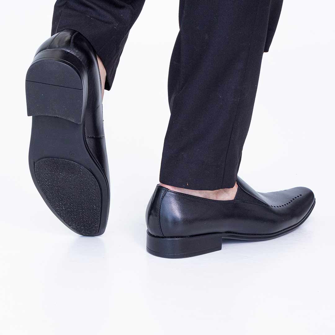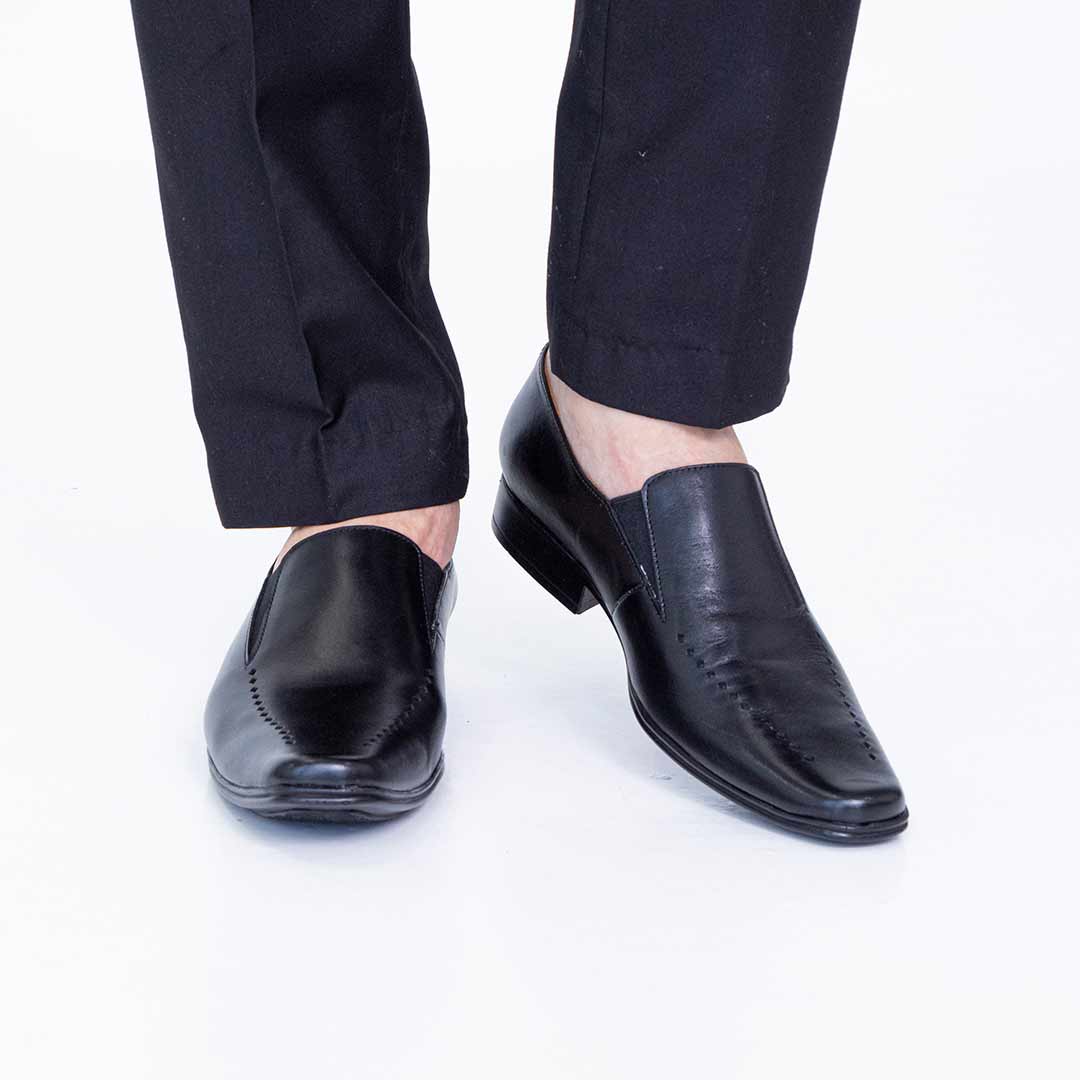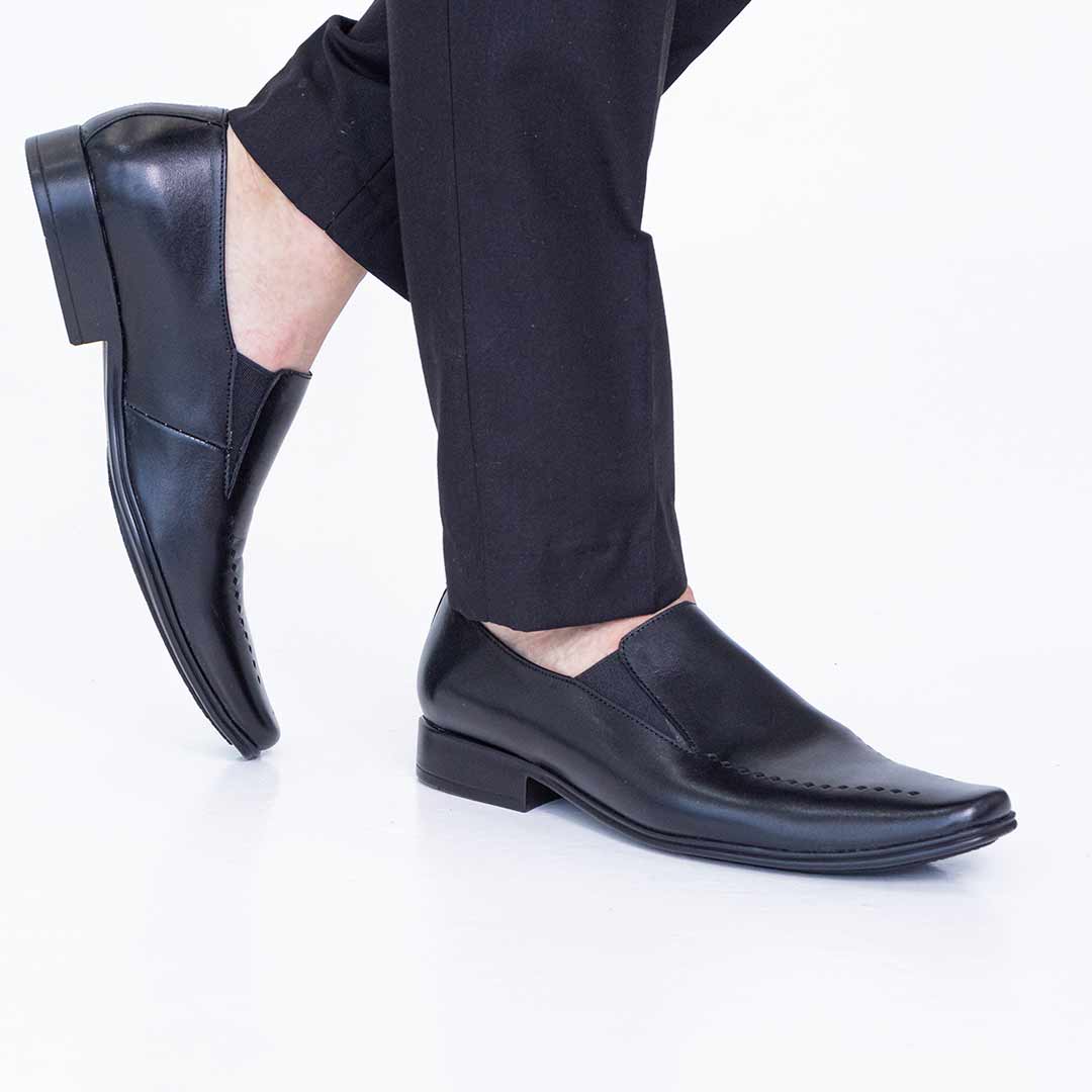 Diseño en cuero negro que combina elegancia y practicidad. Su perfil estilizado y los detalles en la puntera brindan un toque moderno, mientras que la ausencia de cordones ofrece un calce rápido y cómodo. Ideal para el hombre que busca sofisticación y confort en su estilo diario.