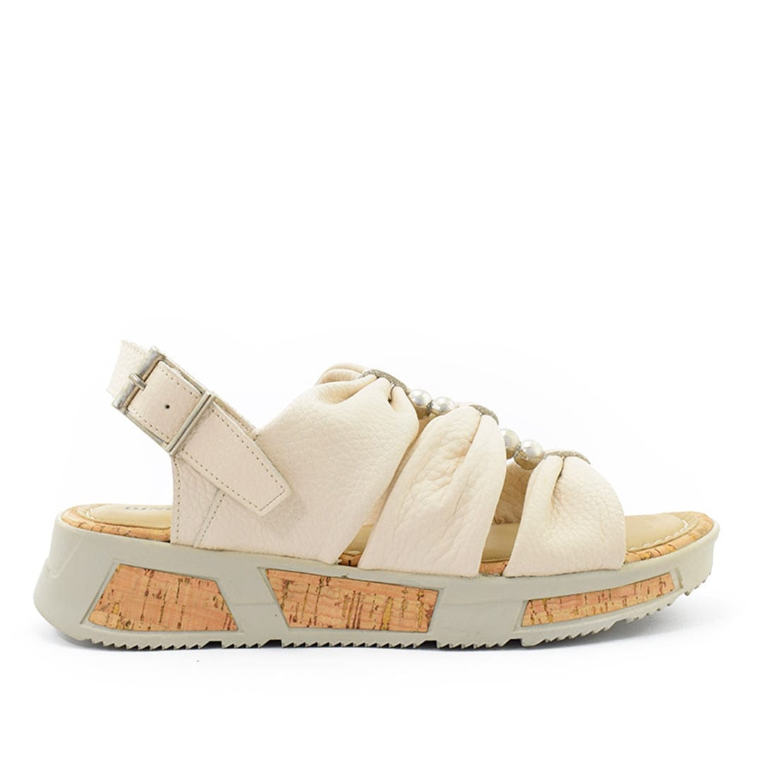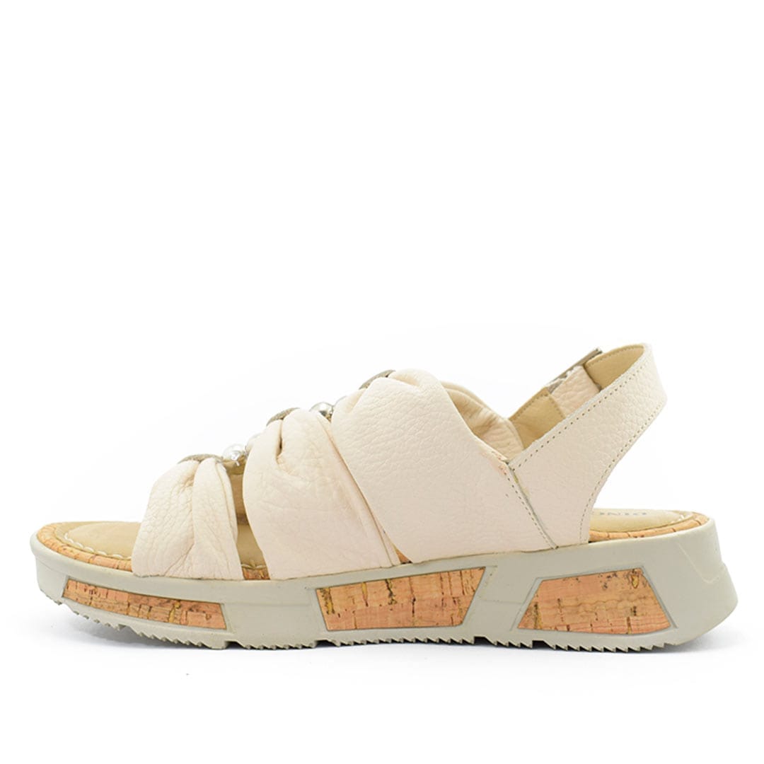 Sandalias modernas con detalles en relieve en el empeine, adornadas con aplicaciones metálicas que le otorgan un toque único y sofisticado. La base incorpora acentos de corcho que complementan su estilo fresco y veraniego.