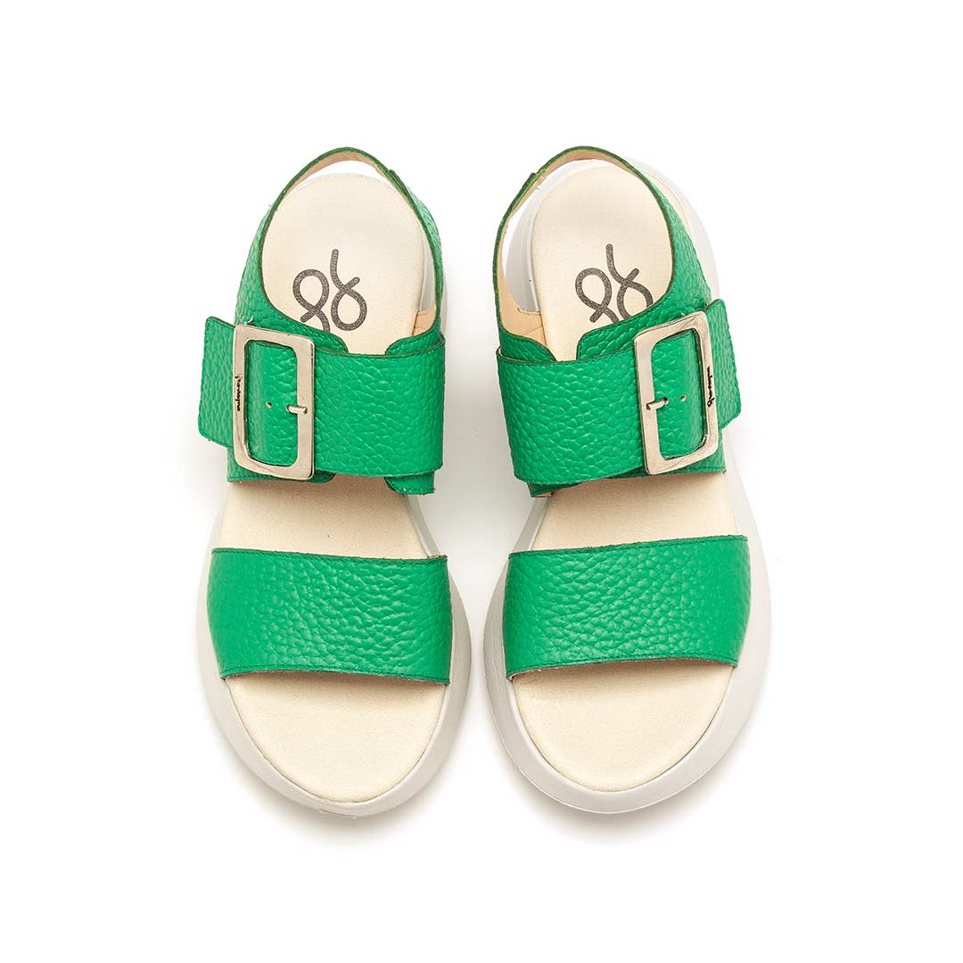 Sandalias vibrantes en tono verde, con tiras anchas y una gran hebilla metálica que aporta estilo y ajuste. Su plataforma blanca y ligera brinda altura y comodidad, haciendo de este modelo la elección ideal.