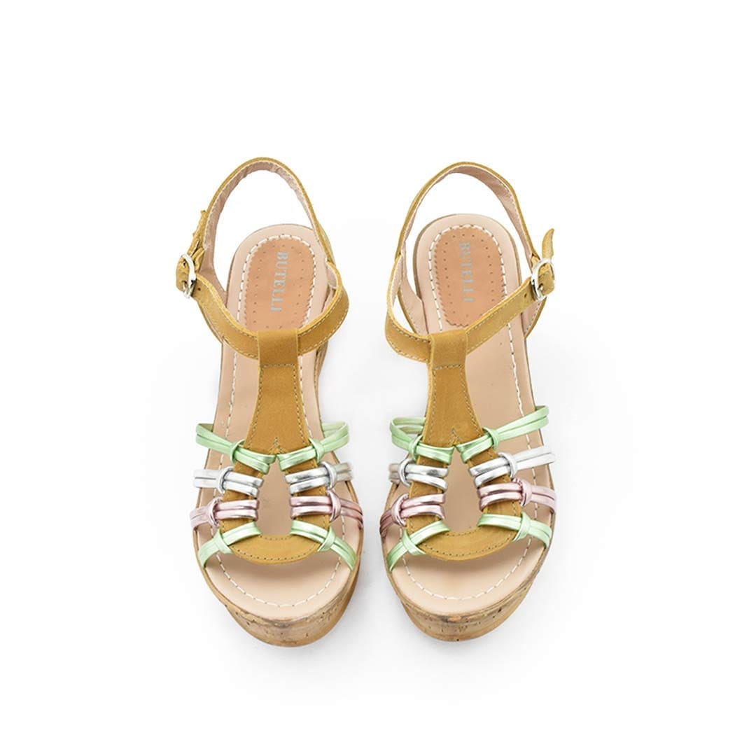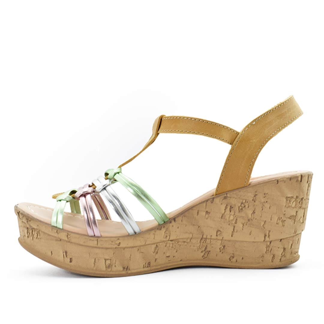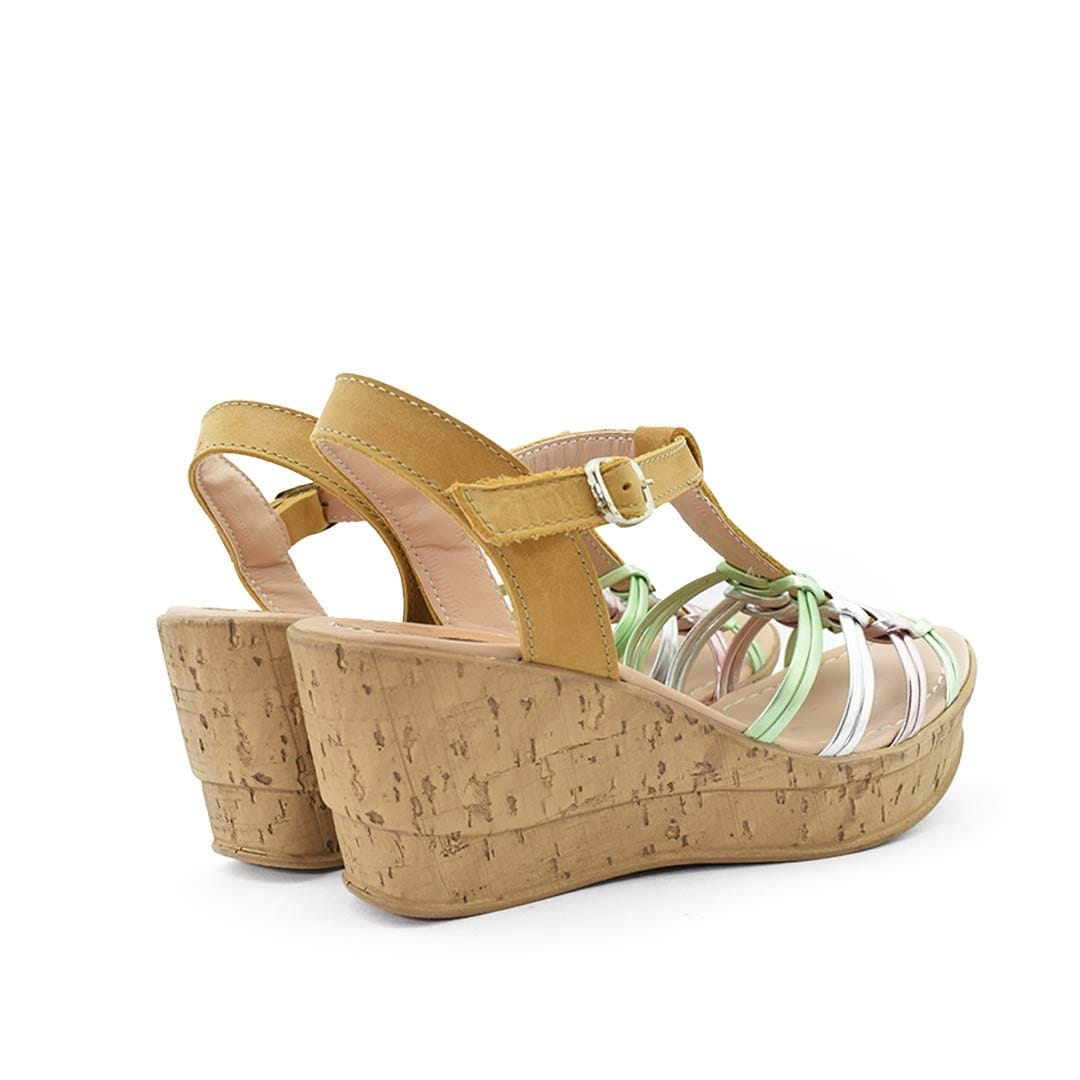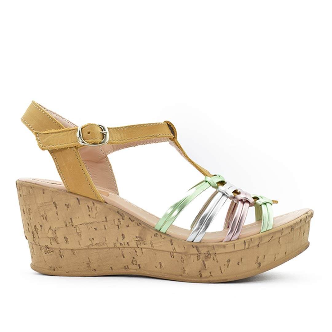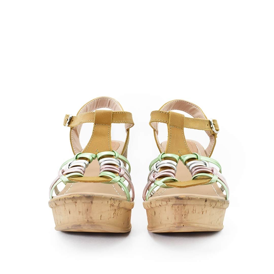 Sandalias con plataforma que destacan por su estilo vibrante y moderno. Las tiras en tonos metalizados añaden un toque de color y brillo, creando un look fresco y sofisticado.