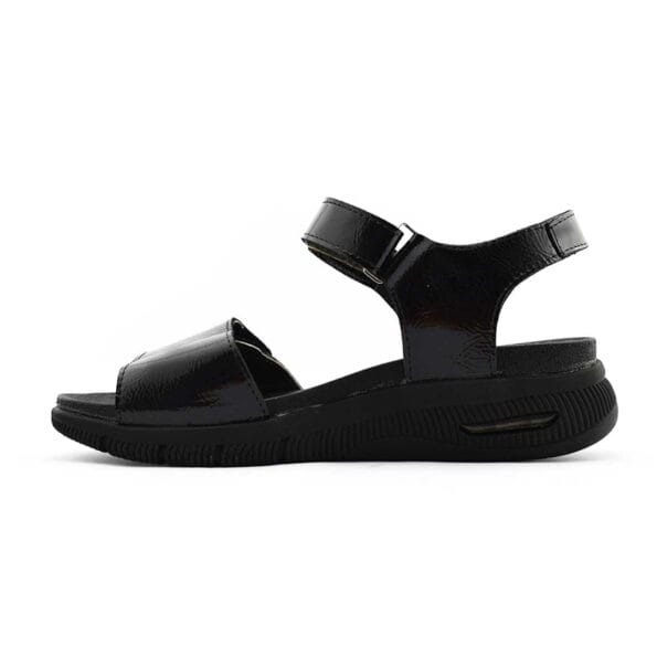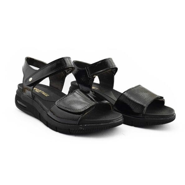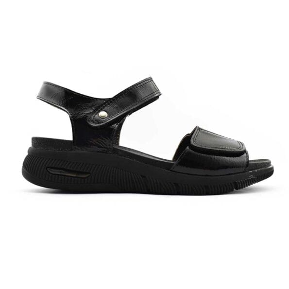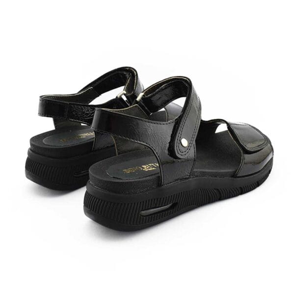 Clásicas sandalias con regulación en empeine y puntera. Realizadas en cuero vacuno floater en charol negro. Posee plantilla sistema a-shock reduce los impactos al caminar. Combínalas con todo tipo de prendas.